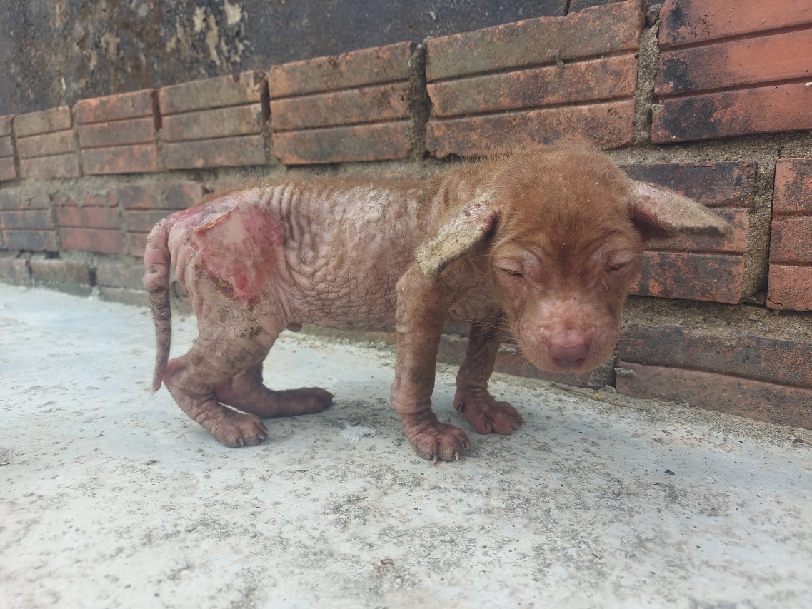 Tình nguyện viên bắt gặp Tom phía sau dãy trọ, hỏi những người xung quanh thì được biết nó đã lang thang ở đây khá lâu. Ước chừng khoảng 4,5 tháng tuổi, là giống chó nhỏ, thân hình còm cõi đầy ghẻ lở, có cả một mảng viêm mủ gần như là hoại tử nơi chân phải.