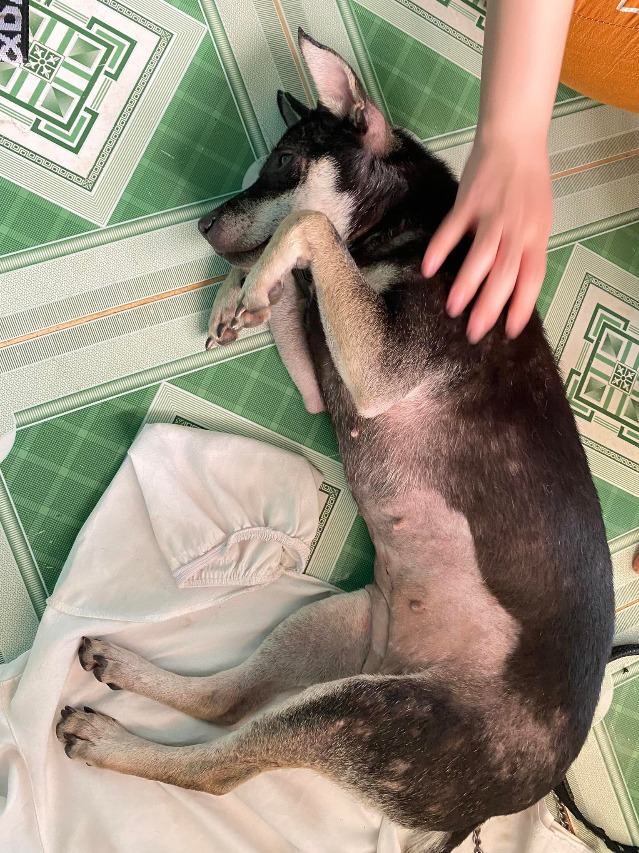 #CODE21C052, Mỡ được tìm thấy ở khu vực đường Nguyễn Cao, ốm yếu, chỉ còn lông đuôi. Tình trạng Mỡ lúc đó suy nhược trầm trọng, thiếu máu, bị ghẻ nặng, nhiễm ký sinh trùng E.canis làm giảm bạch cầu nên cần phải truyền máu.